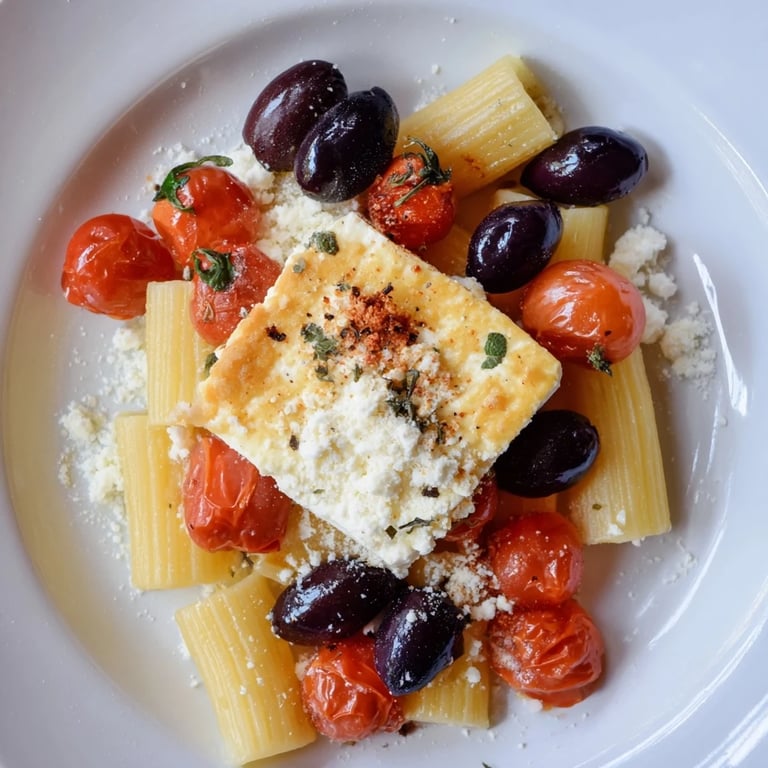 Pin It A vibrant Mediterranean-inspired pasta dish featuring creamy baked feta, sweet cherry tomatoes, and briny olives, all tossed with al dente pasta for a simple yet irresistible meal.