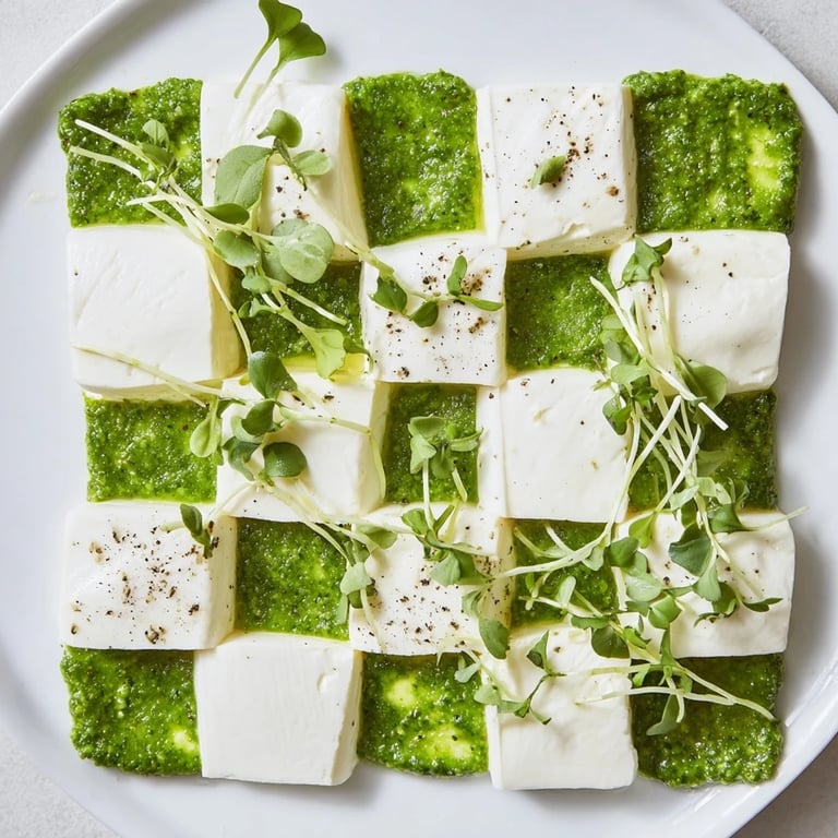 Pin It There's something about arranging food into patterns that makes you feel like an artist instead of just cooking. I was setting up for a dinner party one evening, running behind schedule, when I decided to stop fussing with the usual cheese board and instead try something with actual geometry. The mozzarella, ricotta, and feta came together almost by accident, but once I started laying them in squares with that brilliant green herb paste between them, something clicked. My guests arrived to find this unexpected checkerboard staring back at them from the center of the table, and suddenly everyone was taking photos before even tasting it.