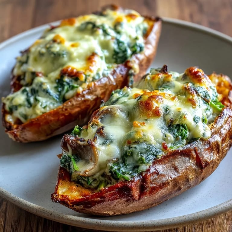 Pin It There's something about sliding a golden-topped sweet potato onto a plate that makes even a Tuesday night feel special. I discovered these stuffed beauties by accident, really—I had cream cheese and spinach lingering in my fridge alongside mushrooms that were at that perfect edge of needing to be used. Roasting the potatoes filled my kitchen with this caramel-like sweetness that somehow convinced me savory was exactly what they needed. The first bite was a small revelation: that creamy, umami-rich filling meeting the soft flesh of the potato, with crispy cheese on top. Now I can't imagine making them any other way.