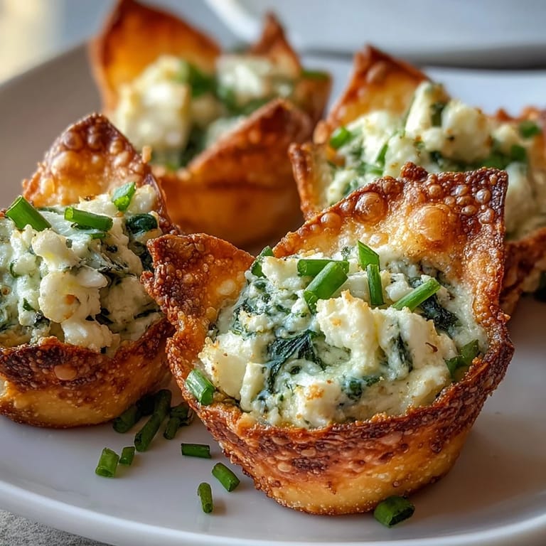 Pin It My neighbor handed me a wonton wrapper one afternoon while we were commiserating over a potluck disaster, and somehow that simple square of dough sparked an idea. I'd been thinking about Greek flavors but wanted something you could eat in one bite, something that wouldn't leave feta crumbles on your good clothes. That's when it clicked—why not bake spinach and feta into crispy wonton cups? The result was so good that people started asking me to bring them to every gathering, and now I can't show my face at a party without a tray of these little golden pockets.